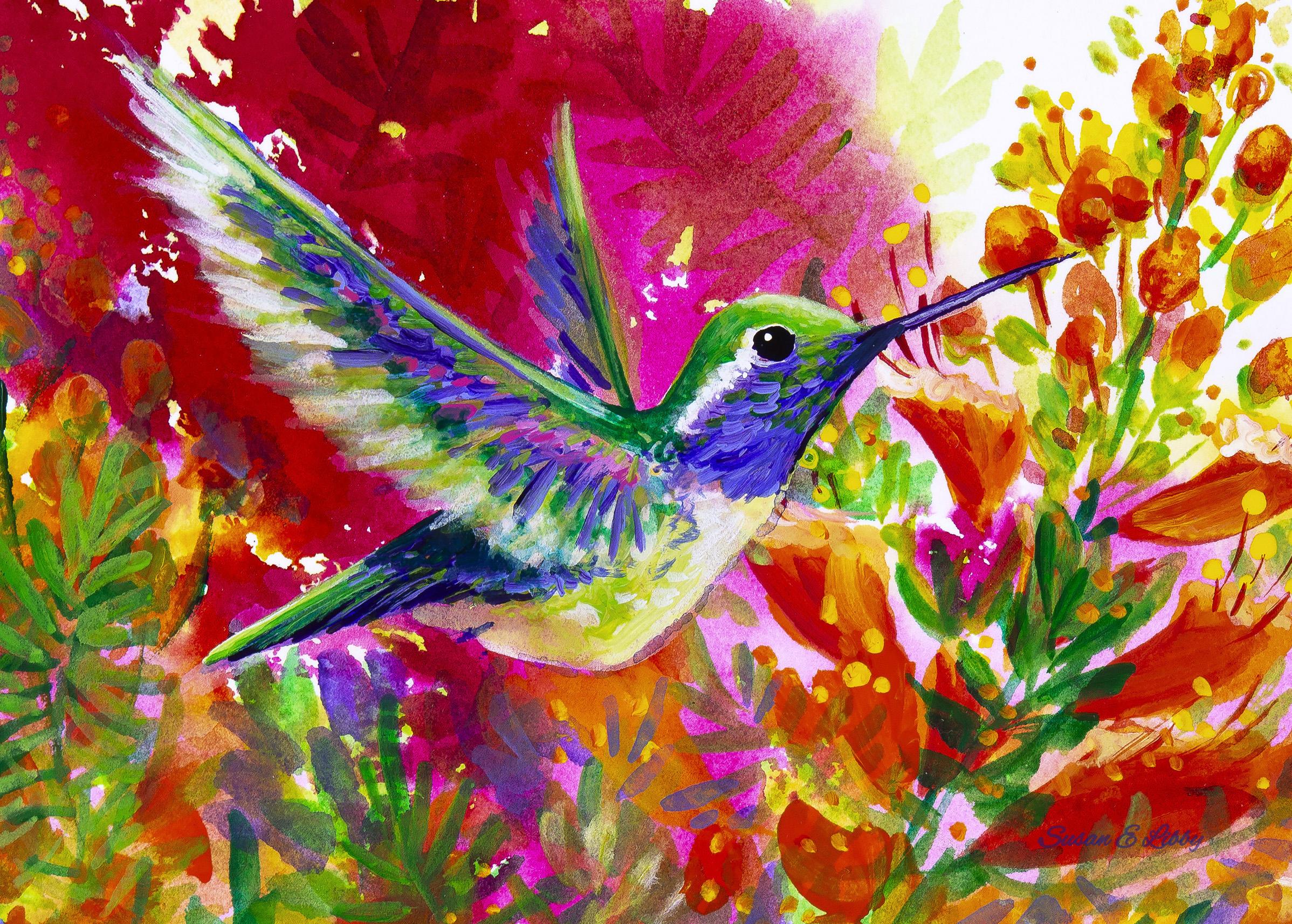 At this point in her career, Susan had been living outside of Arizona. When she and her husband returned to Tucson in 1998, she transitioned from working in commercial art to starting her own business as a painter. She became a member of a local gallery and exhibited her work at a variety of shows and festivals. She often works on several paintings at the same time, working to make sure that the feel of the image effectively connects to the viewer.